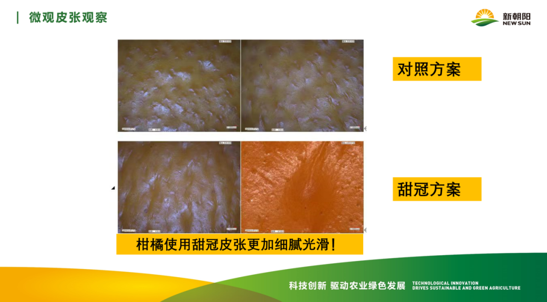 甜冠(冠菌素)適用于各類柑橘品種,如愛媛、金秋砂糖橘、砂糖橘、冰糖橙、金桔、沃柑、耙耙柑、不知火等。促進果實轉(zhuǎn)色、顏色紅潤,表皮靚麗,提升干物質(zhì)積累,如提升糖度、芳香味物質(zhì)積累,提高果實品質(zhì),提前上市,提升抗逆性,延長果實留樹保鮮和果實貨架期,減少流通環(huán)節(jié)損耗。